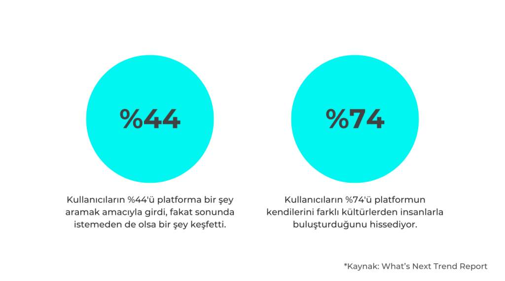 TikTok, kullanıcıların platforma sadece yanıt aramak için değil, aynı zamanda aktif bir düşünce yapısı ile ilgili bakış açılarını keşfetmeye geldiği bir yer olarak gördüğü için “merak” kavramını vurguluyor. Kullanıcıların %44’ü platforma bir şey aramak amacıyla giriyor, fakat sonunda istemeden de olsa bir şey keşfediyor. Bu nedenle TikTok, pazarlamacılara hedef kitlelerini daha derinlemesine incelemelerini ve ilgi alanlarına en uygun içerikleri oluşturmalarını öneriyor. Kullanıcıların markayla ilgili merak edebilecekleri içeriklerin üretilmesi markalarla kuracakları etkileşimin artmasına yardımcı olacaktır.