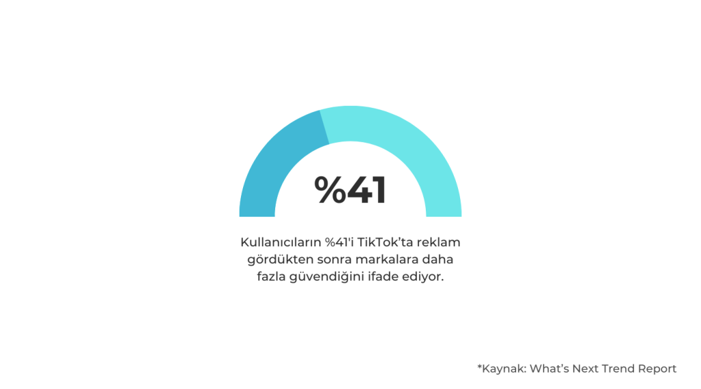 TikTok, yeni reklamcılık formüllerine rağmen marka ve hedef kitle arasında hala bir güven açığı olduğunu belirtiyor. Ancak platform, markaların hedef kitlelerini dinleyip onları anlamasıyla bu açığı kapatmalarına yardımcı olabileceğini belirtiyor. İzleyicilerin %41’i TikTok’ta reklam gördükten sonra markalara daha fazla güvendiğini ifade ediyor.